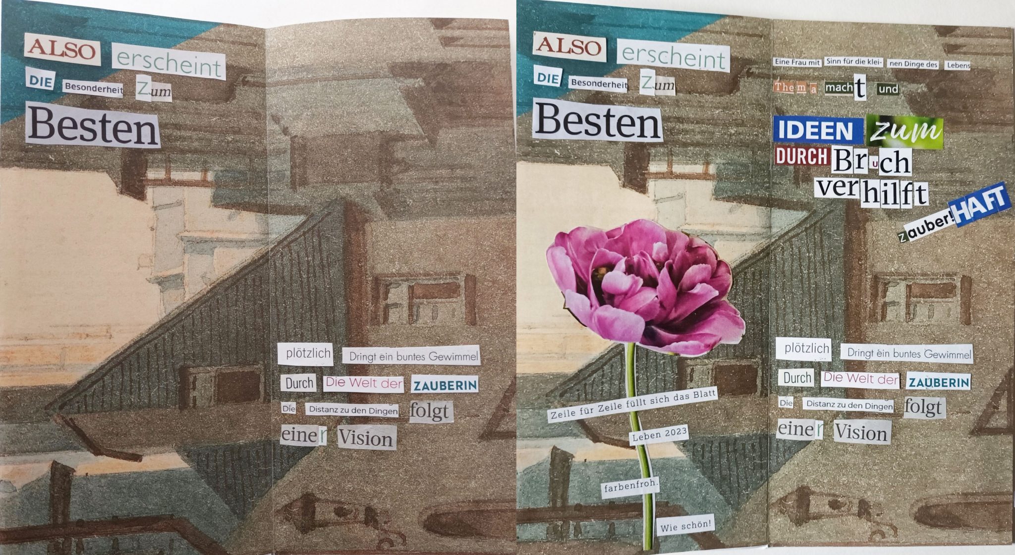 Dieser ana­lo­ge, ergeb­nis­of­fe­ne Aus­tausch, in Form von Col­la­gen, wird mit wert­schät­zen­der Aner­ken­nung krea­tiv und künst­le­risch gestal­tet. Jede legt ihren eige­nen Schwer­punkt, der inspi­rie­rend und respekt­voll ergänzt wird. Der Aus­tausch erfolgt auf dem Postweg.